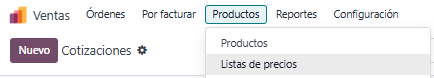 1. Vamos al módulo de Ventas → Productos → Listas de precios