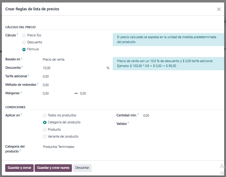 - Cálculo: Aquí puede establecer un precio fijo, descuento, o si es personalizado, aplicar una fórmula.