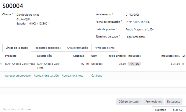 2. Selecciona al cliente “Distribuidora Andina”, y añadimos un producto cualquiera, donde veremos que el precio del producto ya tiene aplicado automáticamente el 10% de descuento.