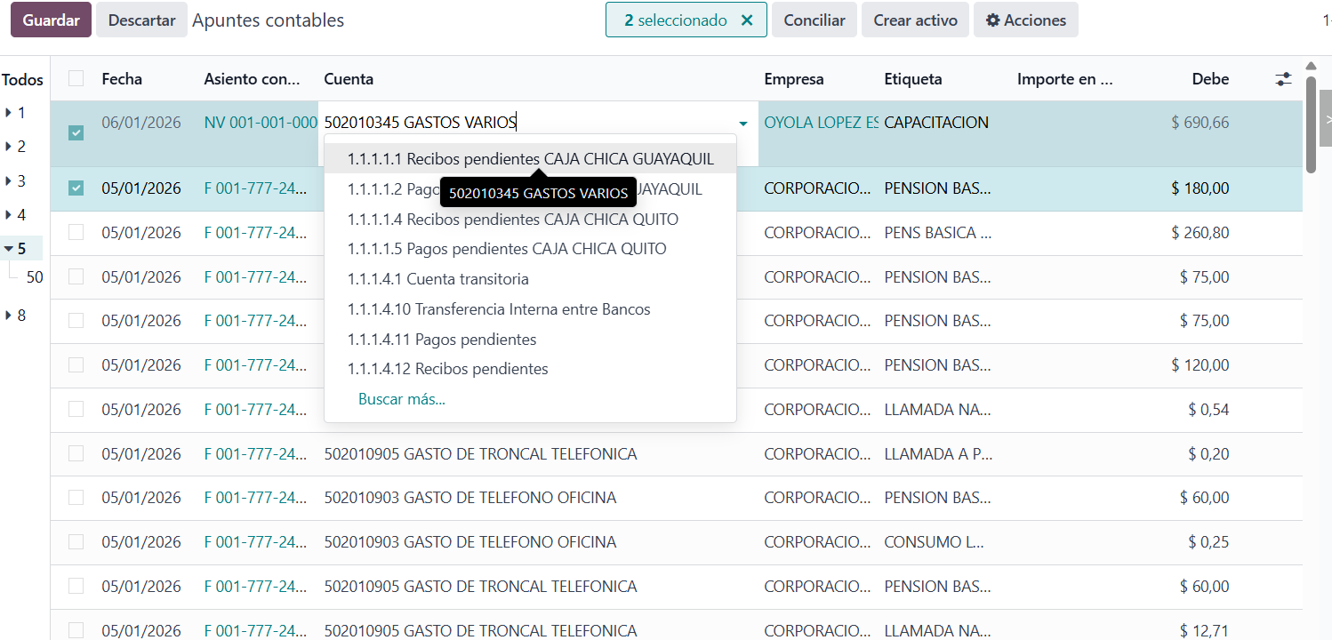 - Una vez seleccionado, proceda a sobreescribir la cuenta contable deseada en la columna "cuenta".