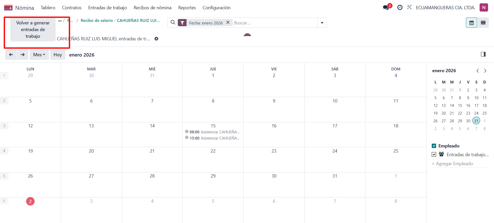 - Escoger a el o los empleados que van a regenerar las entradas de trabajo y seleccionar el rango de fechas que fueron eliminadas.